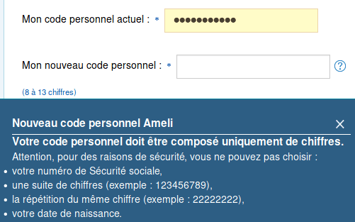 Ameli.fr (French national health insurance) dumb password rule screenshot