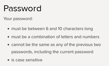 The Roads and Traffic Authority's 'Online Services' website for New South Wales, Australia. Password rules: