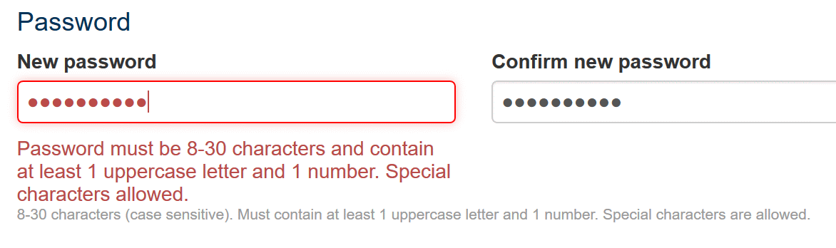 Password must contain 8-30 characters, including one letter and one number. "Special characters allowed" seems to mean a very small handful of choices you can only find through trial and error -_'.@