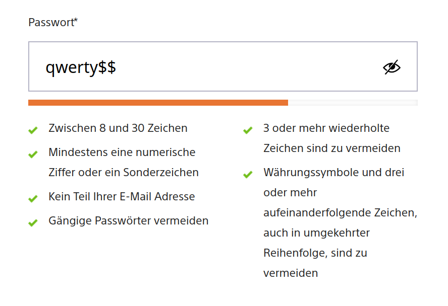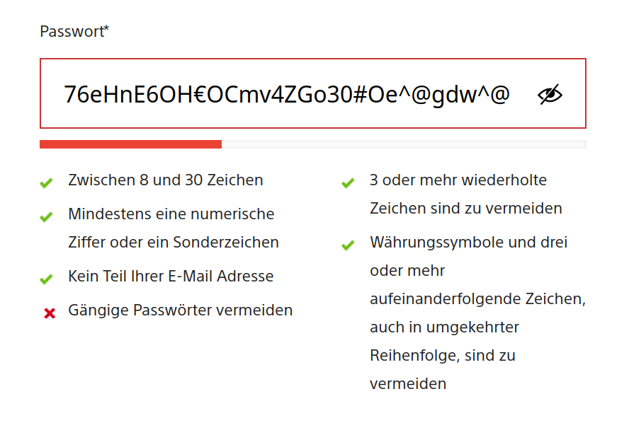 • currency characters and 3 or more consecutive characters, also in reverse order, should be avoided Somehow "$" is not counted as a currency character, but as a special character. Moreover, as soon as the password contains "€", "£" or "元" for example, it is regonized as a common password. Hence "76eHnE6OH€OCmv4ZGo30#Oe^@gdw^@" does not fulfill the requirements while "qwerty$$" does.