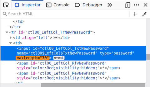 New passwords are silently truncated to 30 characters. Inspecting the change password input field reveals a maxlength="30" attribute, but this isn't obvious to the average user because the field isn't physically wide enough to see the truncation. There is no warning or error message.